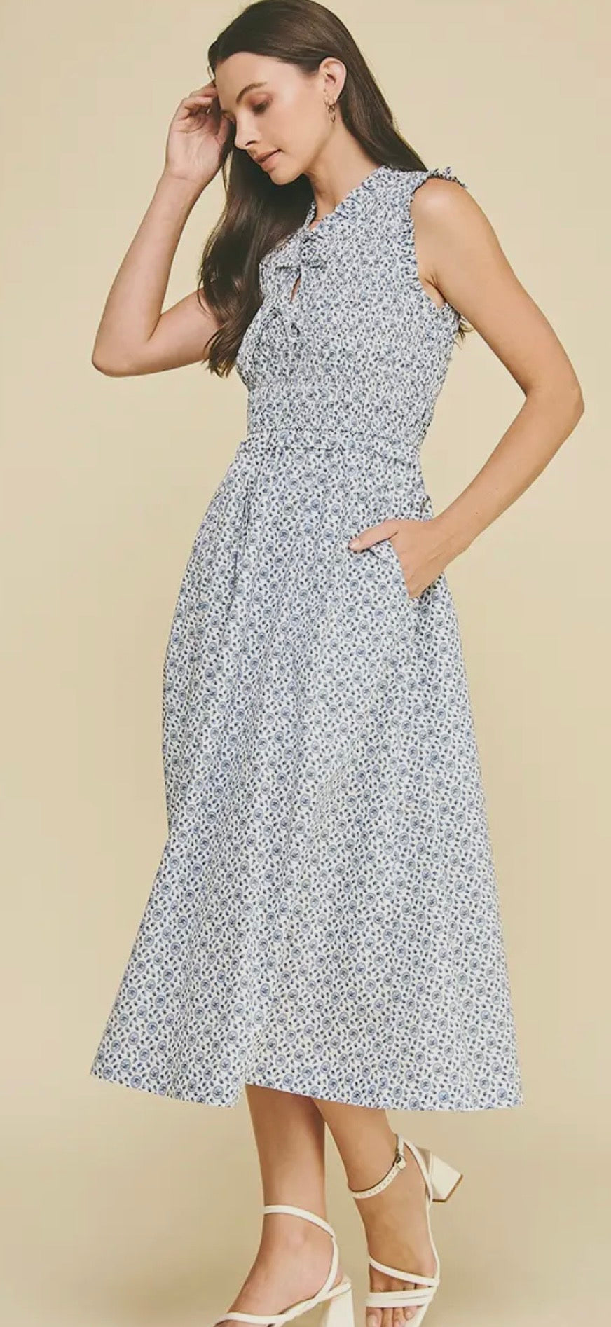 Breeze into spring in this blue-and-white floral midi—the kind of effortless dress you’ll reach for on repeat. Featuring a sweet front-tie neckline with a subtle keyhole, ruffled sleeveless shoulders, and a defined waist that flows into a pleated, swingy skirt, it’s flattering, feminine, and polished without trying too hard. And yes… it has side pockets.