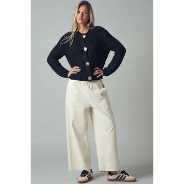 Add texture and charm to your layering game with this black chunky knit cardigan. Featuring sculptural gold buttons and cozy patch pockets, it’s the perfect throw-on for pairing with skirts, dresses, or denim in fall 2025 wardrobes.