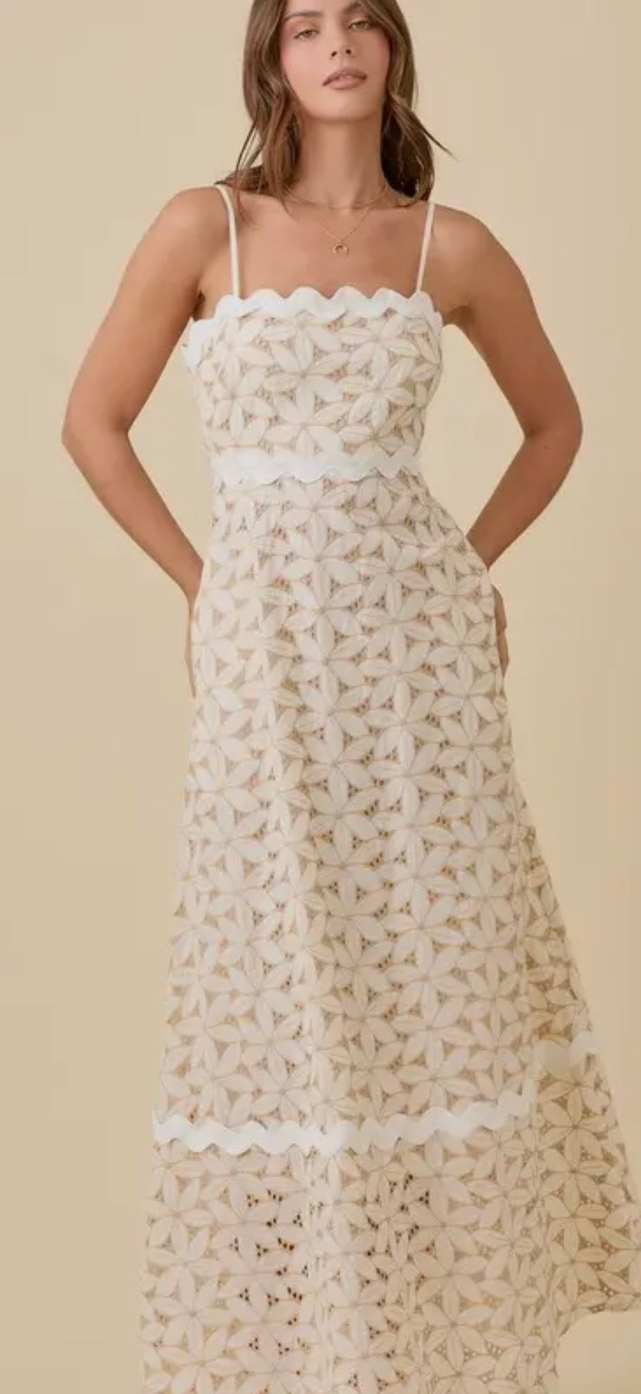 This dreamy lace maxi is giving coastal brunch → beach dinner energy. The soft neutral floral crochet, scalloped trim, and flattering fitted bodice make it an instant “yes”… and it has pockets. ✨