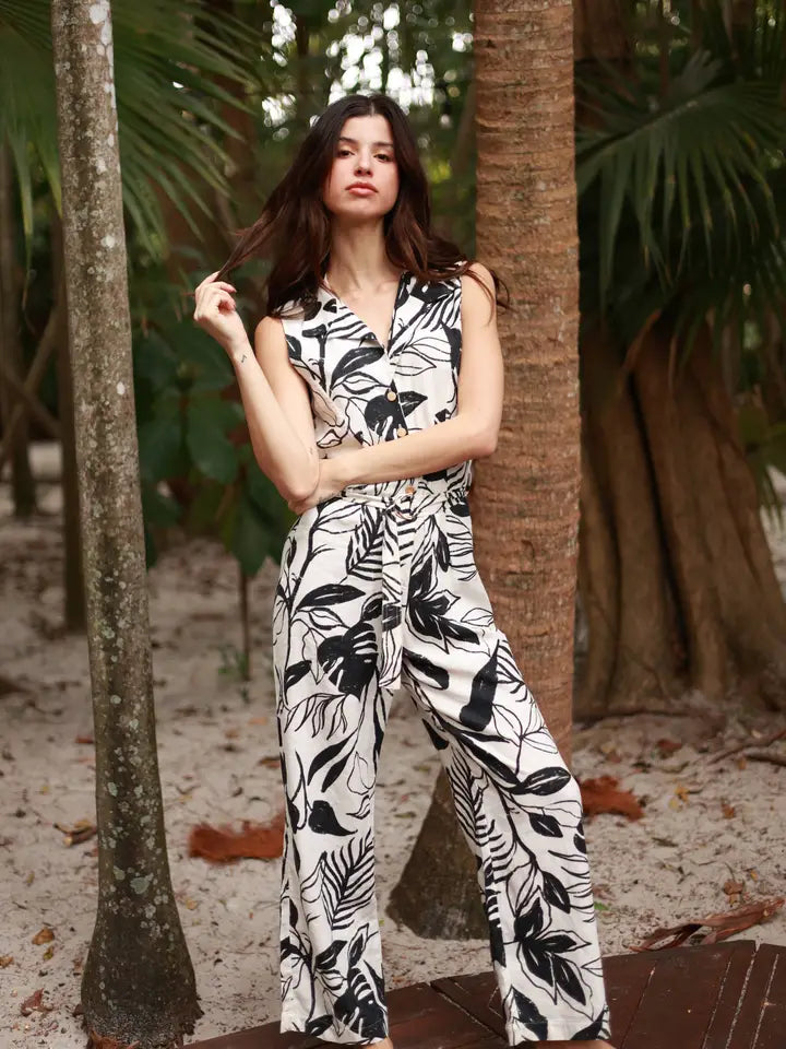 Make a statement with this Havana Print Jumpsuit, crafted from a breathable viscose-linen blend. This vibrant jumpsuit features a bold Havana print, flowy wide legs, and a relaxed fit. Perfect for warm-weather events, resort wear, or a night out on the town. The viscose-linen fabric ensures a comfortable, lightweight wear, while the eye-catching print exudes confidence and style. Pair with sandals or wedges for a chic, effortless look.