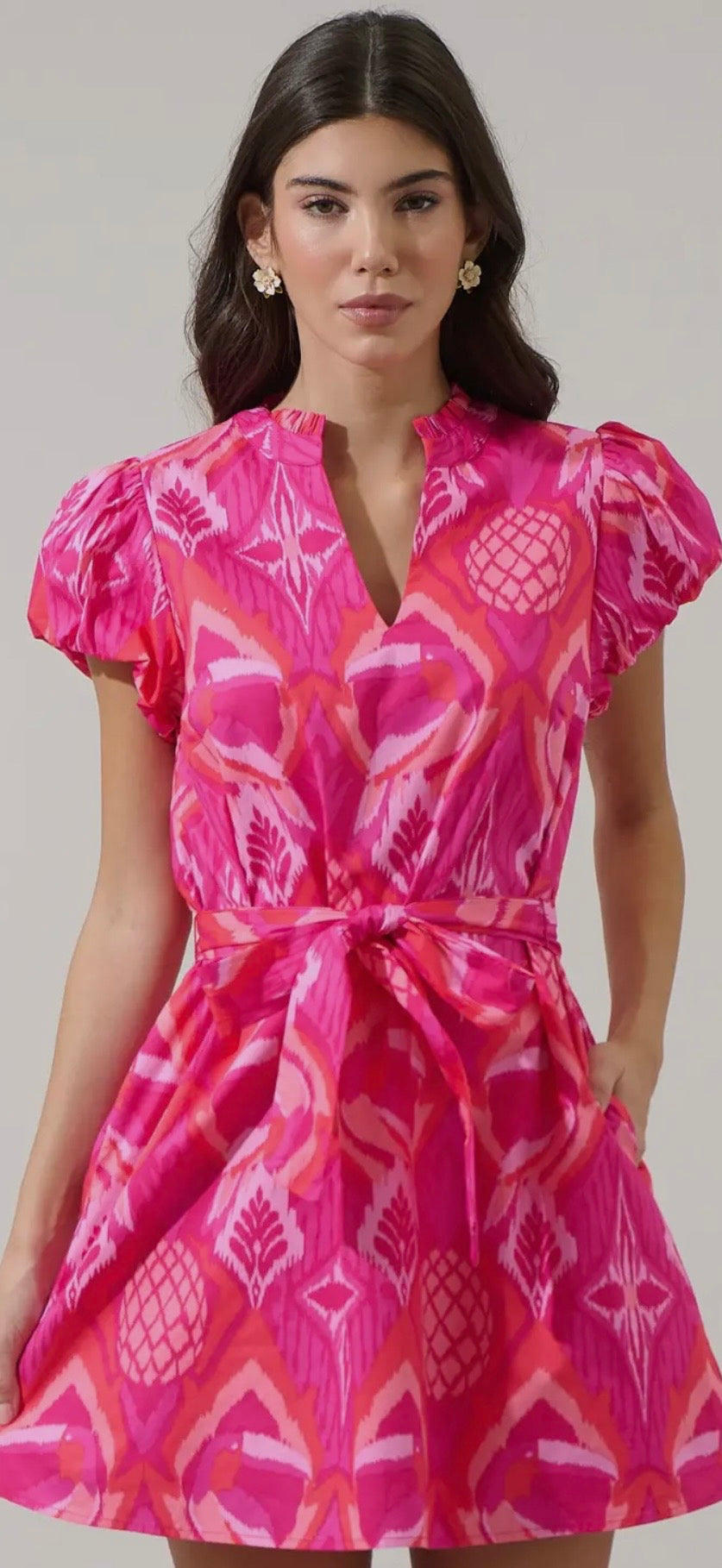 Bold, bright, and made to turn heads. The Prissa Ikat Orela Shift Mini features a vibrant magenta-coral ikat print, soft puff sleeves, and a flattering split neckline. Designed with an easy shift silhouette, this dress can be worn loose for a relaxed look or cinched at the waist with the removable belt for a more defined shape.