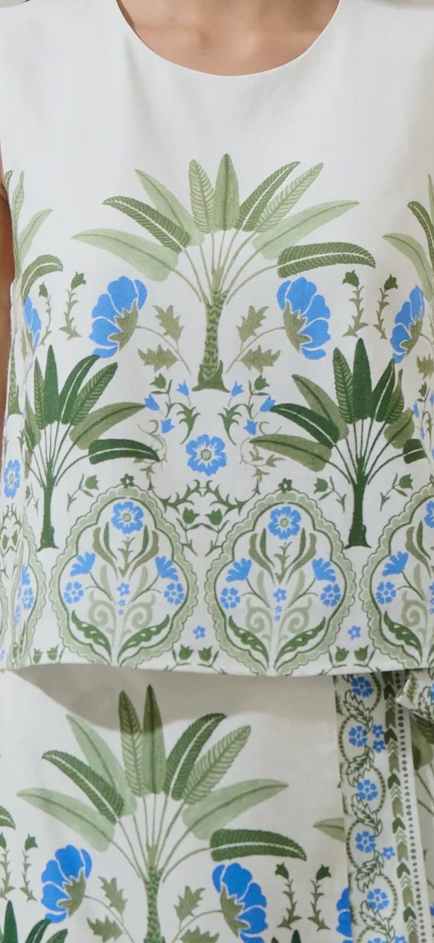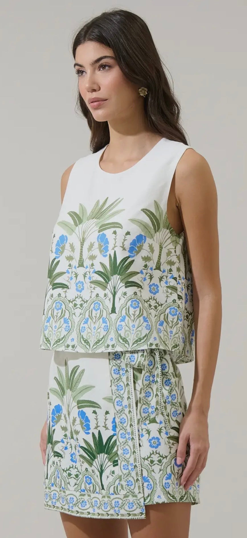 Meet your new warm-weather favorite: the Senara Floral Sleeveless Top. This breezy white tank features a vibrant blue + green floral and palm print that instantly gives “vacation mode.” The slight cropped length is perfect with the matching skirt or high-rise denim, and the keyhole button-back adds a chic finishing touch. Fully lined for easy, confident wear.