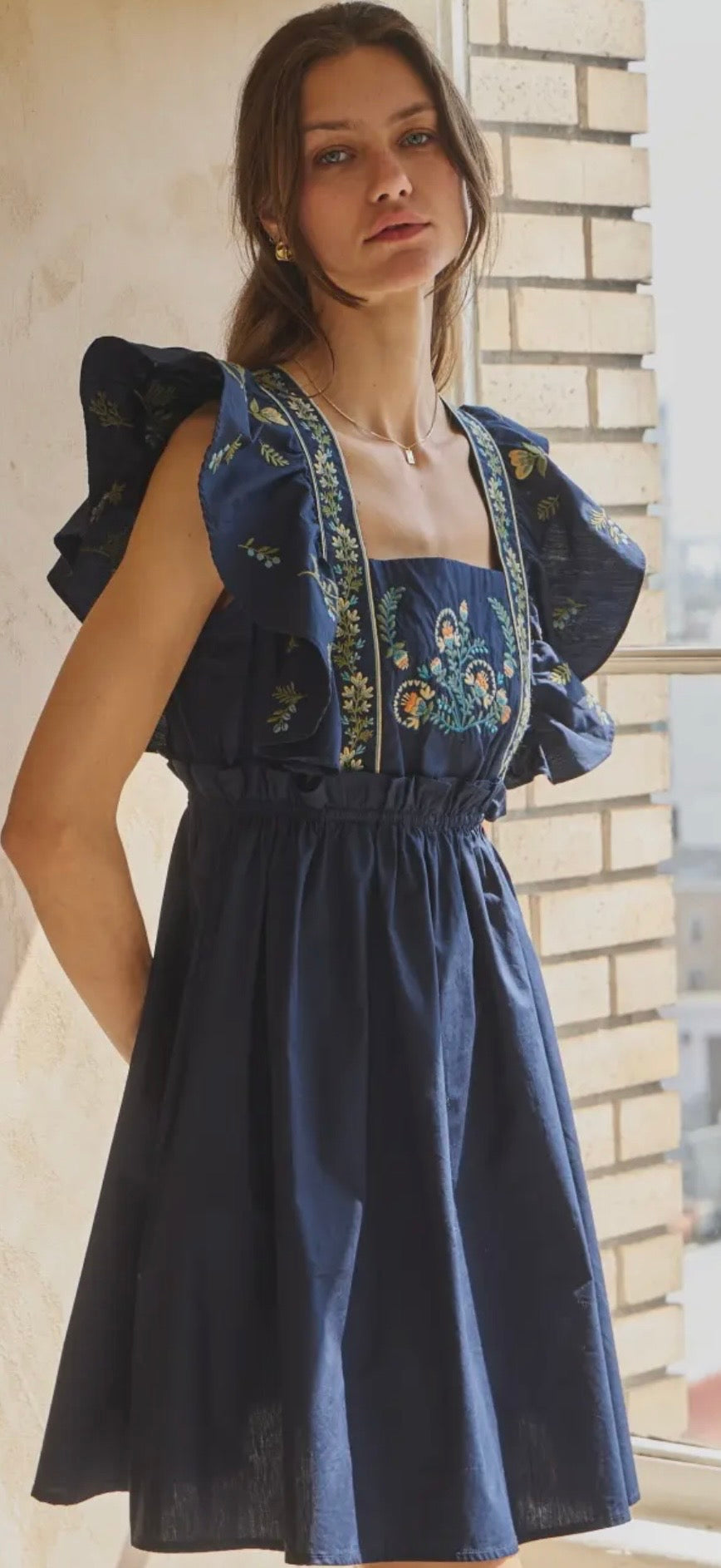 Crisp, feminine, and effortlessly polished — this solid poplin mini dress features delicate front embroidery and soft ruffle sleeves for the perfect touch of detail. The structured yet lightweight cotton blend keeps its shape while still feeling breathable and easy to wear.
